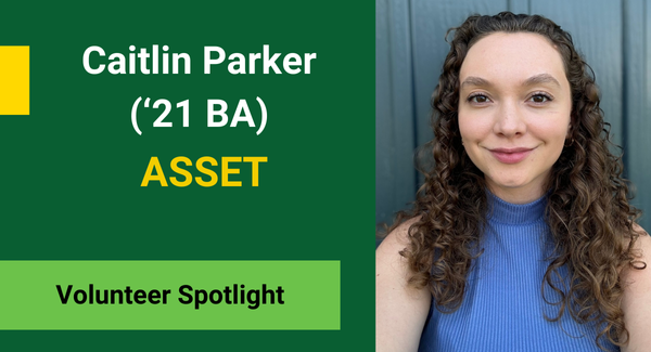 Caitlin Parker (‘21 BA), has been a dedicated member of the Alumni Student Support and Engagement Team (ASSET) since 2023. Currently pursuing a Master of Counselling at City University Seattle, her studies help inform her volunteer contributions to the mental health and wellness of U of A students.